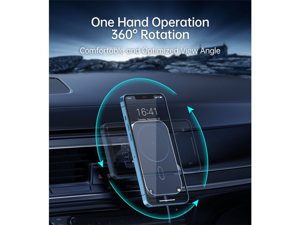 Magnetické uchycení umožňuje snadné přichycení i sejmutí telefonu jednou rukou. Kompaktní provedení nepřekáží ve výhledu řidiče a zachovává čistý vzhled interiéru vozidla.