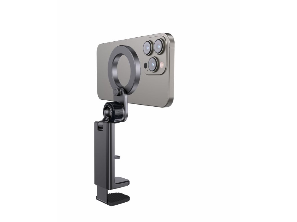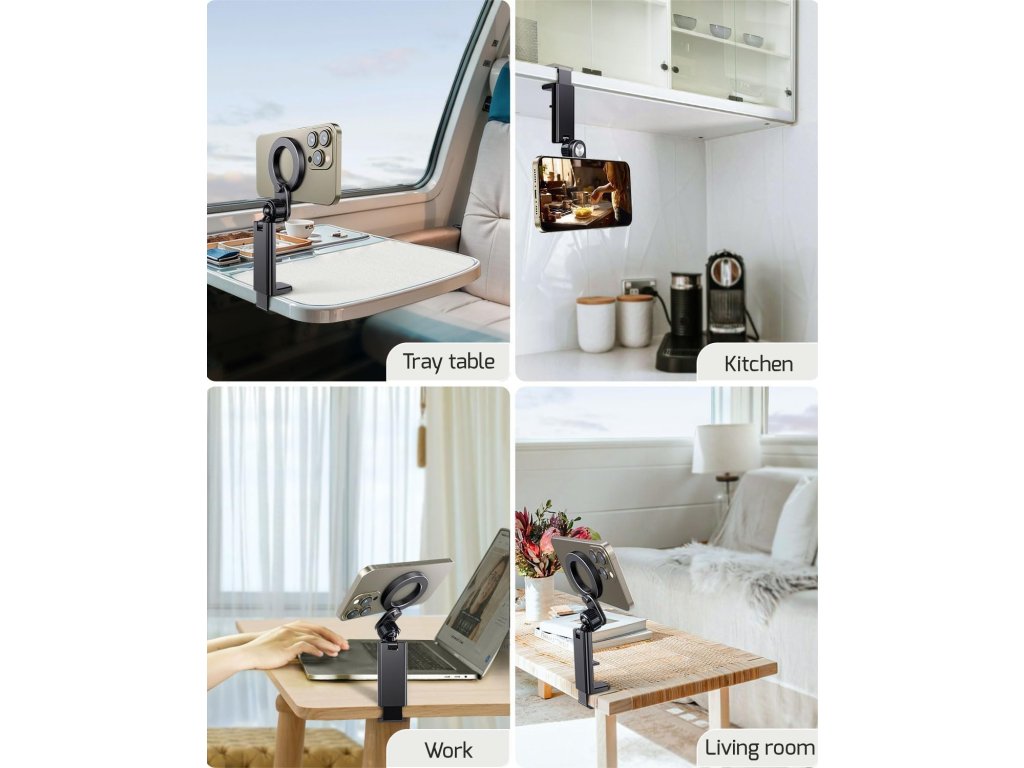 Díky čelisťovému mechanismu lze držák upevnit na plochy do tloušťky 35 mm. Skvěle se hodí pro použití v kuchyni, kanceláři, dílně nebo při cestování, například na opěrku sedadla v letadle. Umožňuje pohodlné sledování videí, videohovory i hands-free používání telefonu.