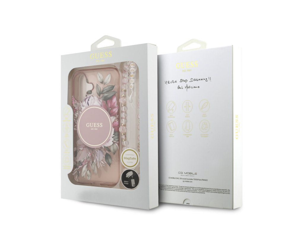 Guess IML Flower Pearl Strap MagSafe zadní kryt na telefon je skvělým doplňkem pro všechny milovníky stylu a praktičnosti. Tento kryt je vyroben z kombinace pevného PC plastu na zadní straně a TPU měkkého plastu na bocích, což vytváří dokonalou symbiózu odolnosti a pohodlí. Díky přesnému tvaru perfektně sedí na telefonu a umožňuje snadný přístup ke všem tlačítkům a konektorům. Tento kryt podporuje technologii MagSafe, což znamená, že je kompatibilní s bezdrátovým nabíjením a dalšími MagSafe doplňky. Design krytu vyniká logem Guess ve zlatém kruhu, což z něj činí nejen praktický, ale i stylový doplněk, který skvěle doplní váš outfit. Součástí krytu je i korálkové poutko, které plní nejen estetickou funkci, ale zajistí také bezpečné držení telefonu v ruce. Pokud hledáte kryt, který kombinuje eleganci a funkčnost, je tento kousek od GUESS tou pravou volbou pro vás. Klíčové vlastnosti: - Originál Guess - Poutko kolem zápěstí součástí krytu - Lehký a odolný kryt z prémiového PC a TPU - Skvěle se drží v ruce a neklouže - Podpora MagSafe - Přesně kopíruje tvar telefonu a umožňuje snadný přístup k tlačítkům a konektorům. - Chrání telefon před prachem a poškrábáním - Stylový a funkční doplněk pro váš telefon i outfitDoplňkové parametry