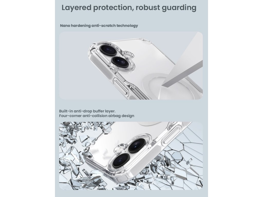 Nillkin Nature TPU PRO Magnetic ochranný kryt telefonu s integrovaným magnetem pro Apple MagSafe příslušenství. Kryt je oproti klasickému Nature TPU vybaven magnetem a je vyrobený z kombinace dvou materiálů PC/TPU. Odolný a pevný polykarbonát (PC) na zadní straně, který je odolný proti poškrábání a TPU pružný materiál na bocích. PC část krytu zůstává barevně stálá a nežloutne jako jiná pouzdra. Díky této kombinaci poskytne tu nejlepší ochranu pro Váš telefon. Ochrání ho spolehlivě před poškrábáním, prachem ale také velmi dobře při nechtěném pádu. Kryt je tenký a z čirého materiálu, který podtrhne design Vašeho telefonu. Díky nízké tloušťce podporuje i bezdrátové nabíjení. Přesné výřezy na ovládací prvky a potřebné konektory zajišťují pohodlnou obsluhu telefonu. Vlastnosti - Materiál TPU/PC - Pevný polykarbonát (PC) na zadní straně - PC část krytu nežloutne a zůstává barevně stálá - Měkké TPU boky - Integrovaný magnet pro Apple MagSafe příslušenství - Perfektní ochrana telefonu - Plně přístupná tlačítka a konektory - Vyroben přesně na míru telefonuDoplňkové parametry