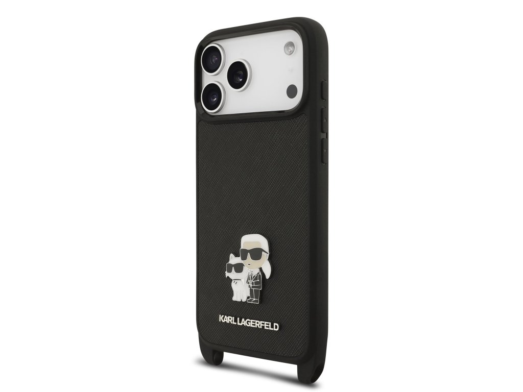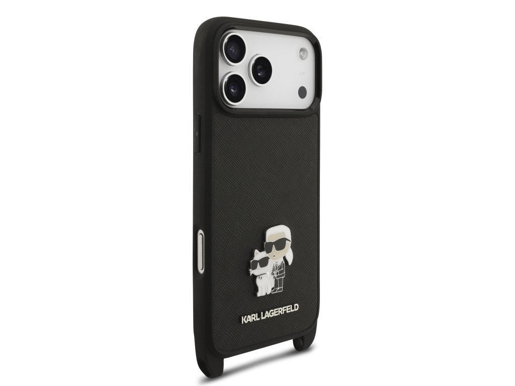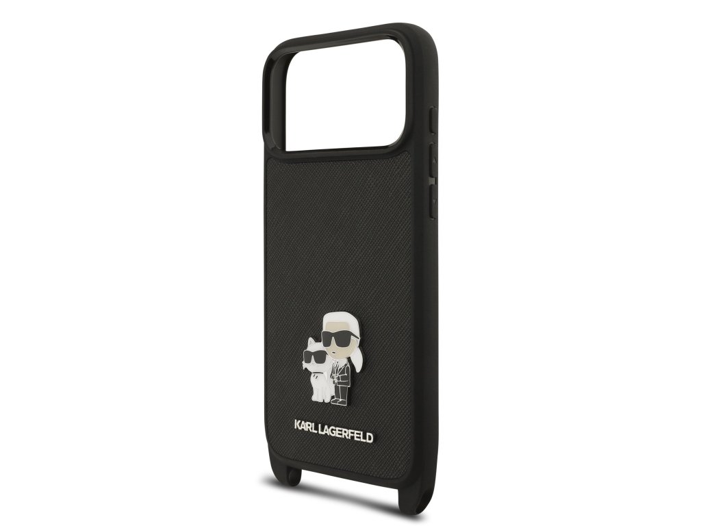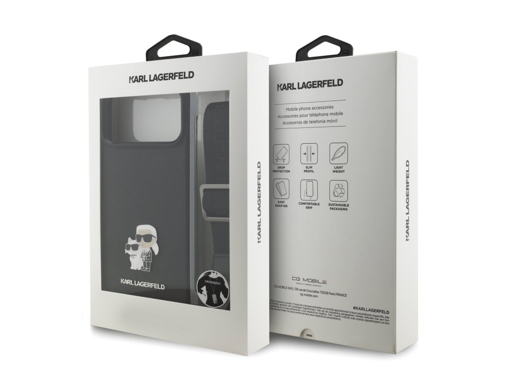 Karl Lagerfeld Saffiano Crossbody Popruh Metal Karl and Choupette Zadní Kryt pro iPhone 17 Pro Black