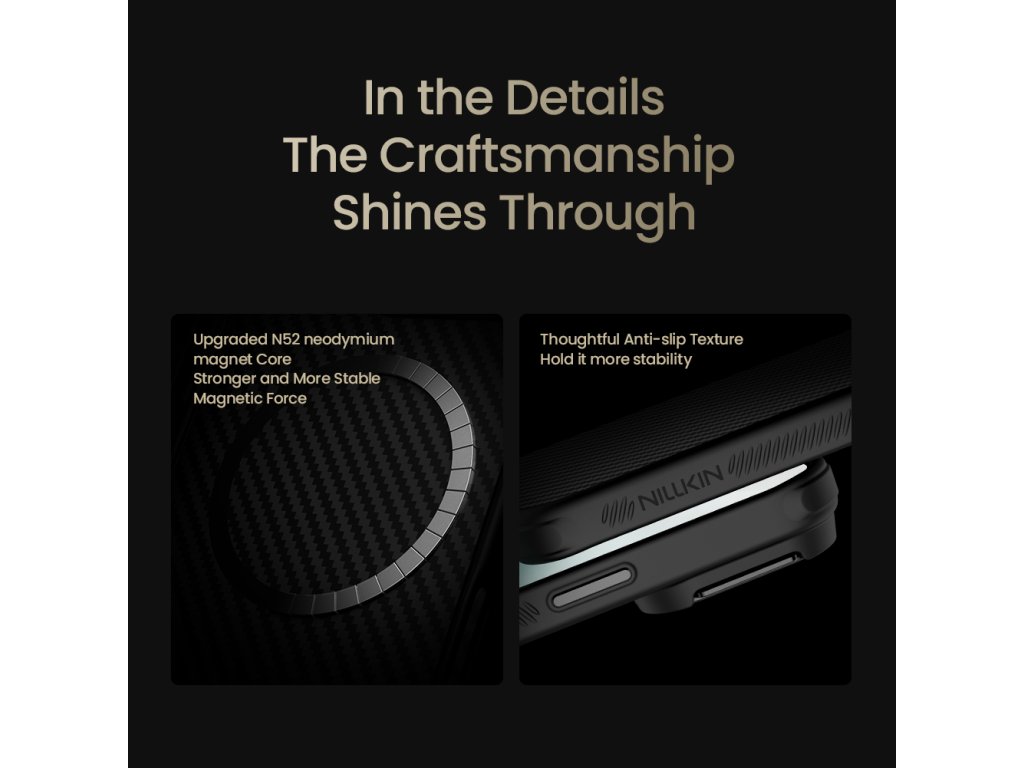 Nillkin CarboProp aramid zadní kryt je vyroben z aramidového vlákna, běžně známého jako "černé zlato" v materiálovém průmyslu. Aramidová vlákna a TPU poskytuje vašemu telefonu komplexní ochranu. Zadní strana: Vojenský materiál, 5x pevnější než ocel. Rámečky: TPU měkký rámeček, 360° ochrana. Fotoaparát: Kovový rámeček zabraňuje nárazům a poškrábání. Přední strana: 0,5 mm zvednutý rámeček pro ochranu displeje. Kreativní design kovového rámu kolem fotoaparátu nejen chrání fotoaparát, ale také slouží jako stojánek. Díky vestavěnému silnému magnetu si můžete MagSafe užívat podle libosti. Vyznačuje se dobrými izolačními a nevodivými vlastnostmi, které neovlivňují používání GPS, sítě, signálu a bezdrátového nabíjení. - Vlastnosti: - Aramidové vlákno - TPU materiál - Kovový rámeček kolem fotoaparátu, který zároveň slouží jako stojánek. - Zvýšené rámečky kolem displeje - Silný magnet N52 - Přesné výřezy - Neomezuje signál, ani bezdrátové nabíjeníDoplňkové parametry