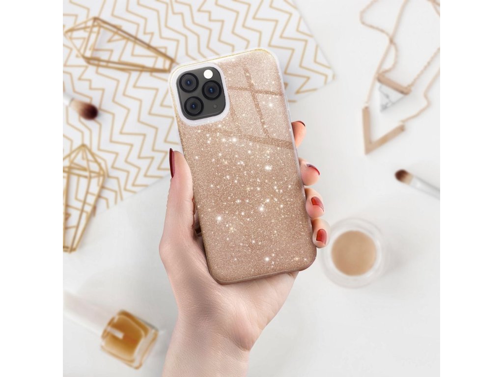 Pouzdro je složené ze tří vrstev – flexibilního TPU, pevného PC a třpytivého prášku. Díky této konstrukci je kryt lehký, tenký a zároveň odolný. Podn ěšené hrany chrání displej i čočky fotoaparátu před poškozením při položení na rovný povrch.