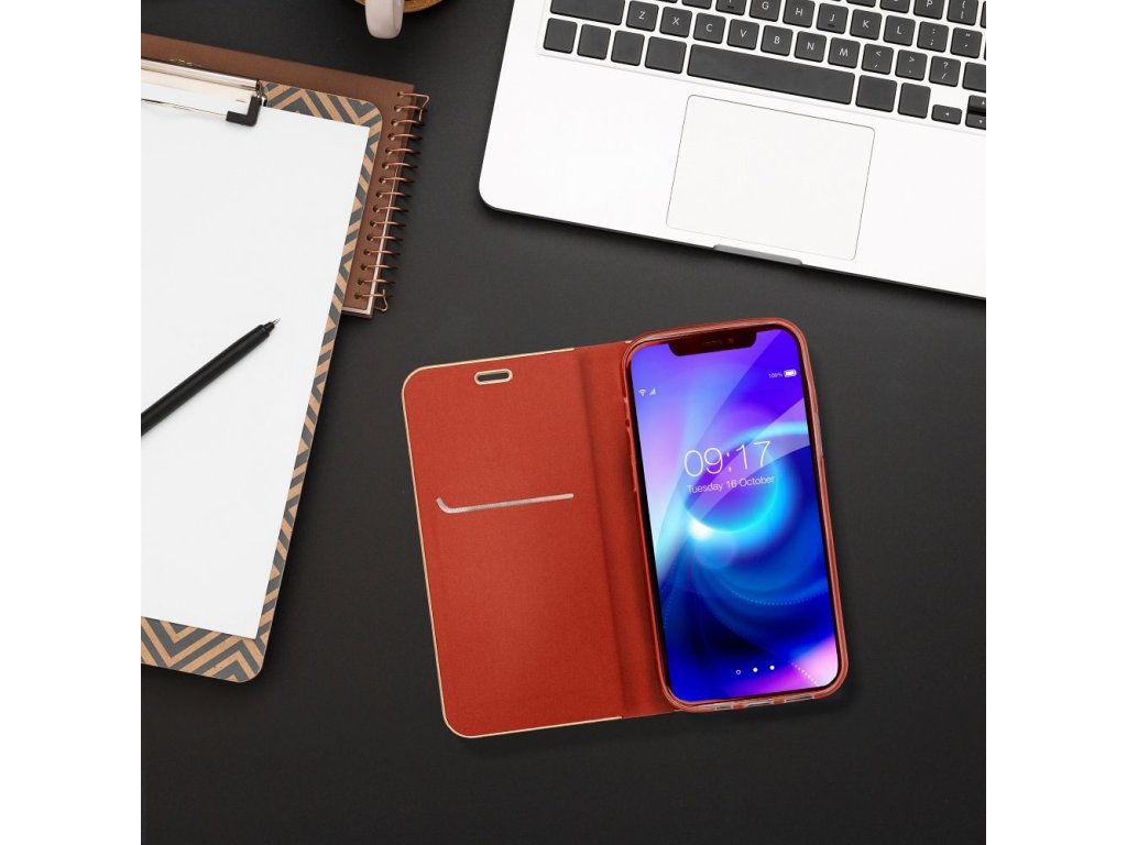 Uvnitř pouzdra Luna Book Gold naleznete flexibilní silikonový držák, který je přesně na míru pro Váš smartphone SAMSUNG Galaxy A56 5G. Telefon udržuje ve stabilní poloze a chrání jeho okraje. Na vnitřní straně se také nachází kapsa, kterou můžete využít jako peněženku nebo úschovnu na Vaše doklady či karty.