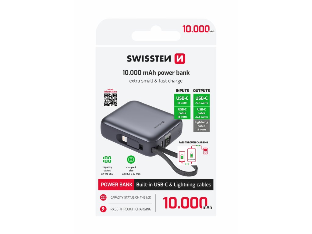 Powerbanka Swissten Space 10 000 mAh s integrovanými kabely USB-C & Lightning – stříbrná