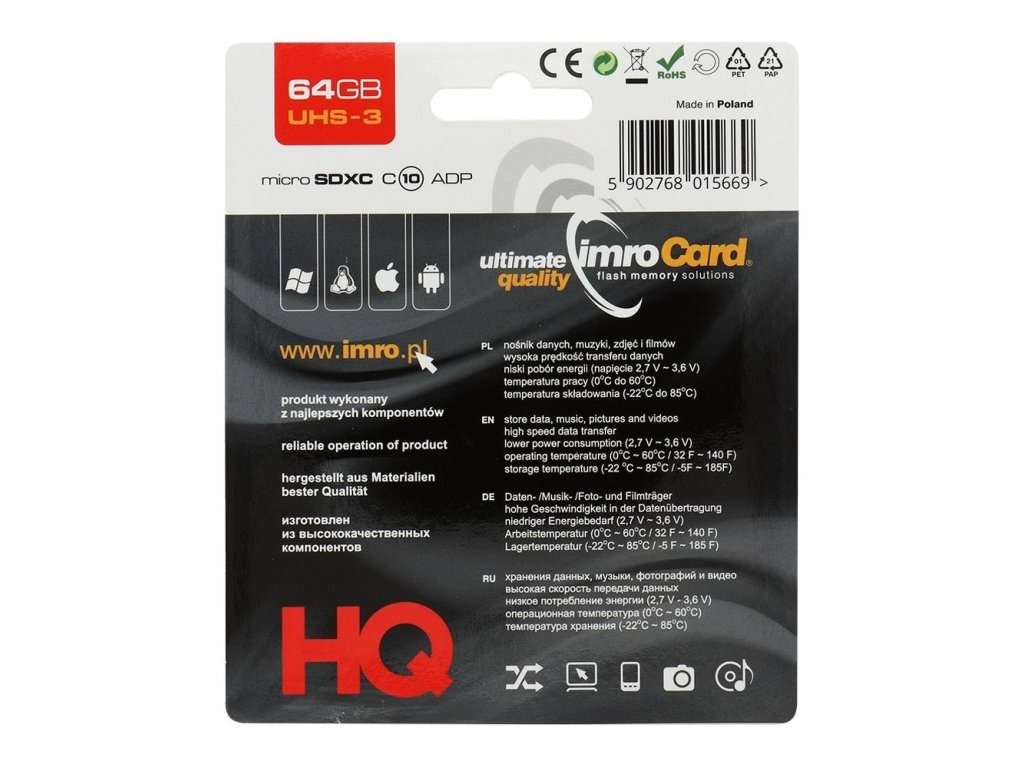 Paměťová karta kompaktní velikosti MicroSD s adaptérem SD o kapacitě 64 GB se vyznačuje rychlým čtením a zápisem a doživotní zárukou. Karta IMRO polského výrobce byla postavena na komponentech nejvyšší kvality. Díky svým malým rozměrům se vyznačuje minimální spotřebou energie.