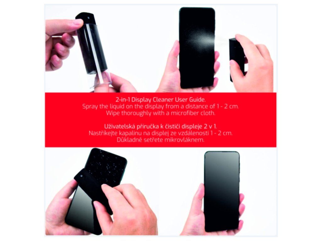 Čisticí prostředek nastříkejte rovnoměrně na displej. Poté jej setřete mikrovláknovou utěrkou, která je součástí produktu. Před použitím doporučujeme čistič protřepat.