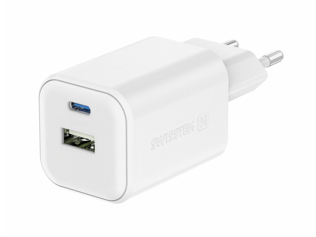 Síťový adaptér Swissten GaN 1× USB-C 45 W PD + 1× USB-A QC – bílý