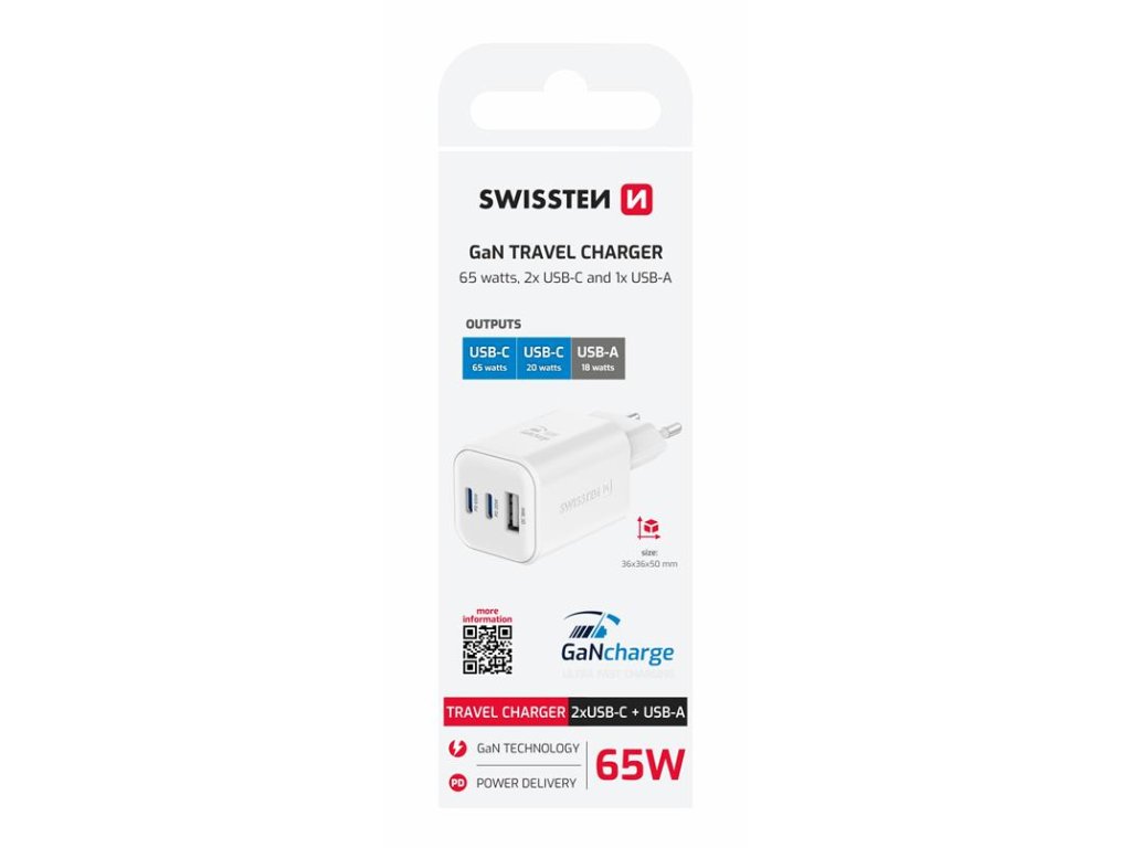 Síťový adaptér Swissten GaN 2× USB-C 65 W PD + 1× USB-A QC – bílý