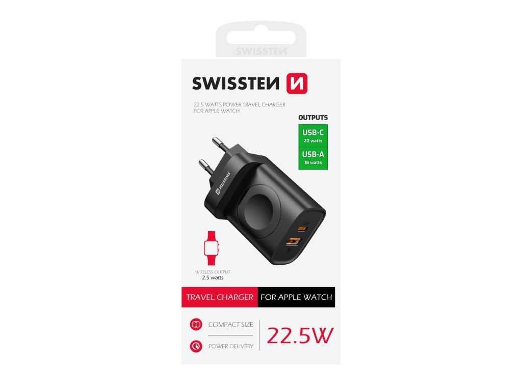 Síťový adaptér Swissten USB-C + USB-A s bezdrátovým nabíjením Apple Watch – 20 W